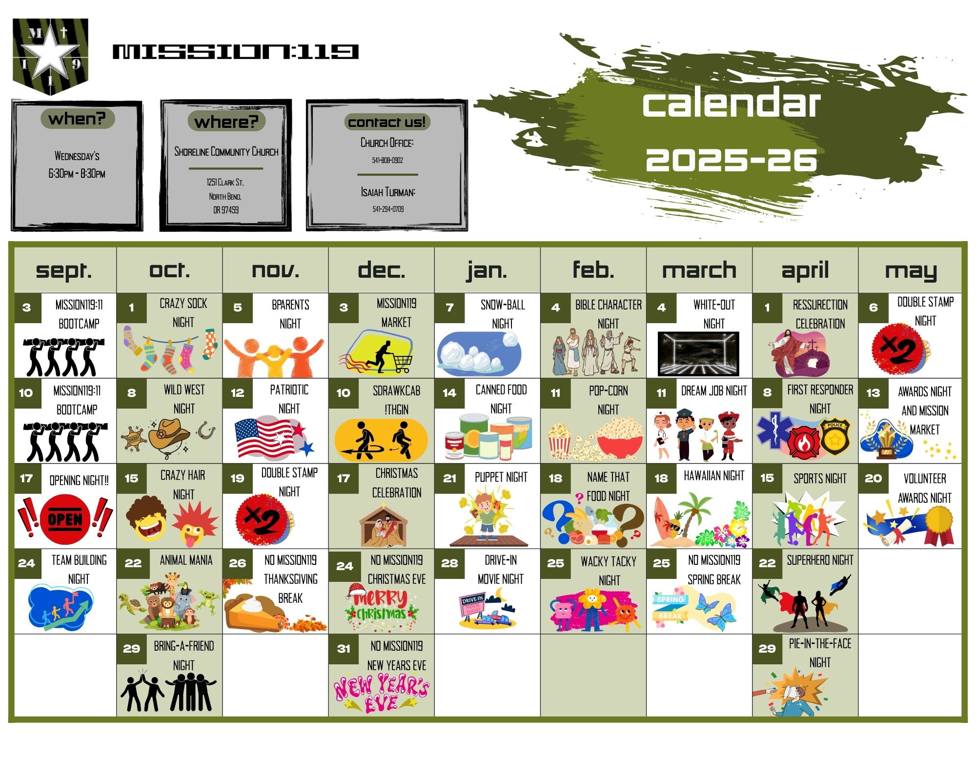 December 3 ~ “Mission 119 Market” December 10 ~ “White Out Night” December 17 ~ “Christmas Celebration” December 24 ~ “Christmas Break” December 31 ~ ” Happy New Years”